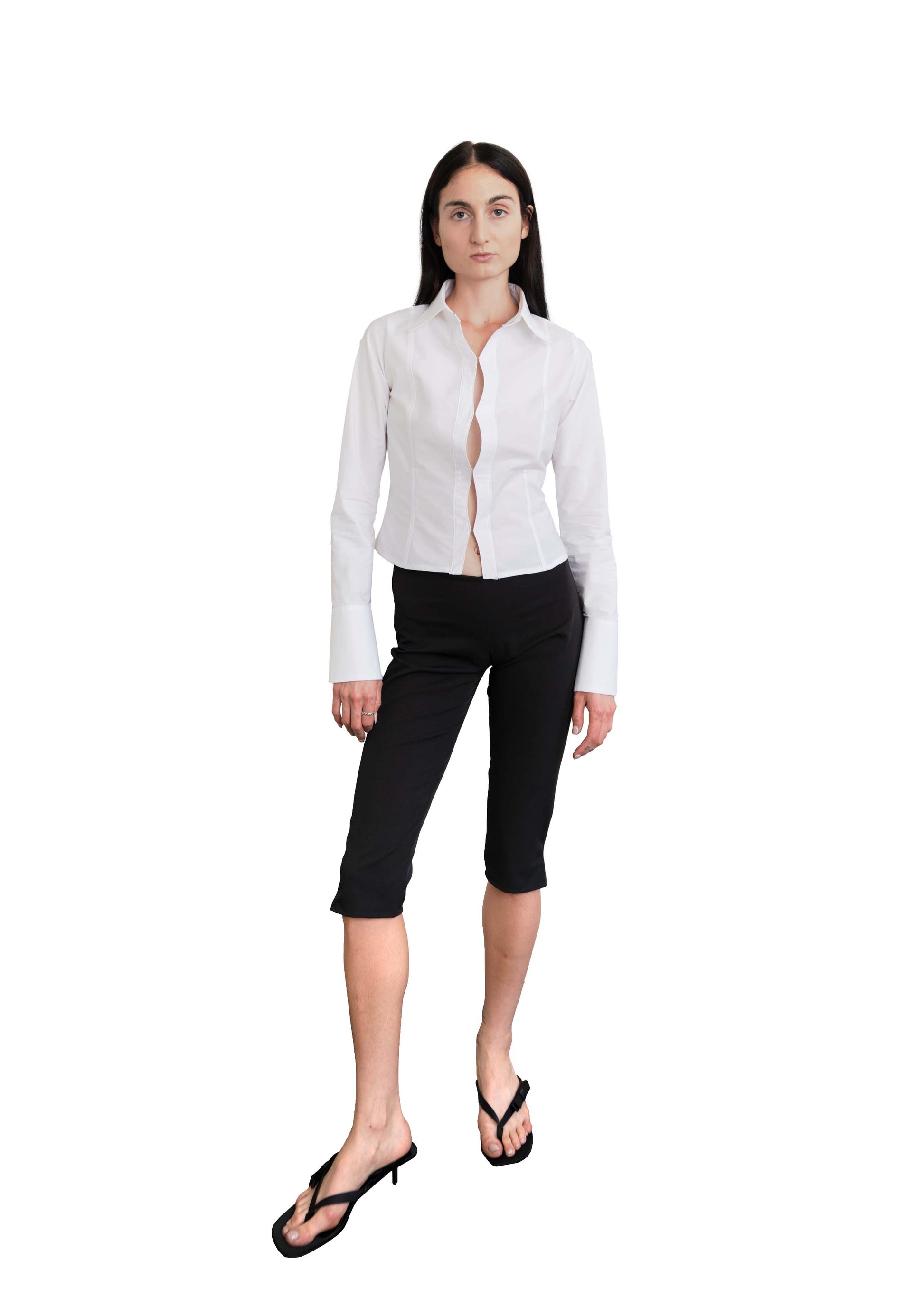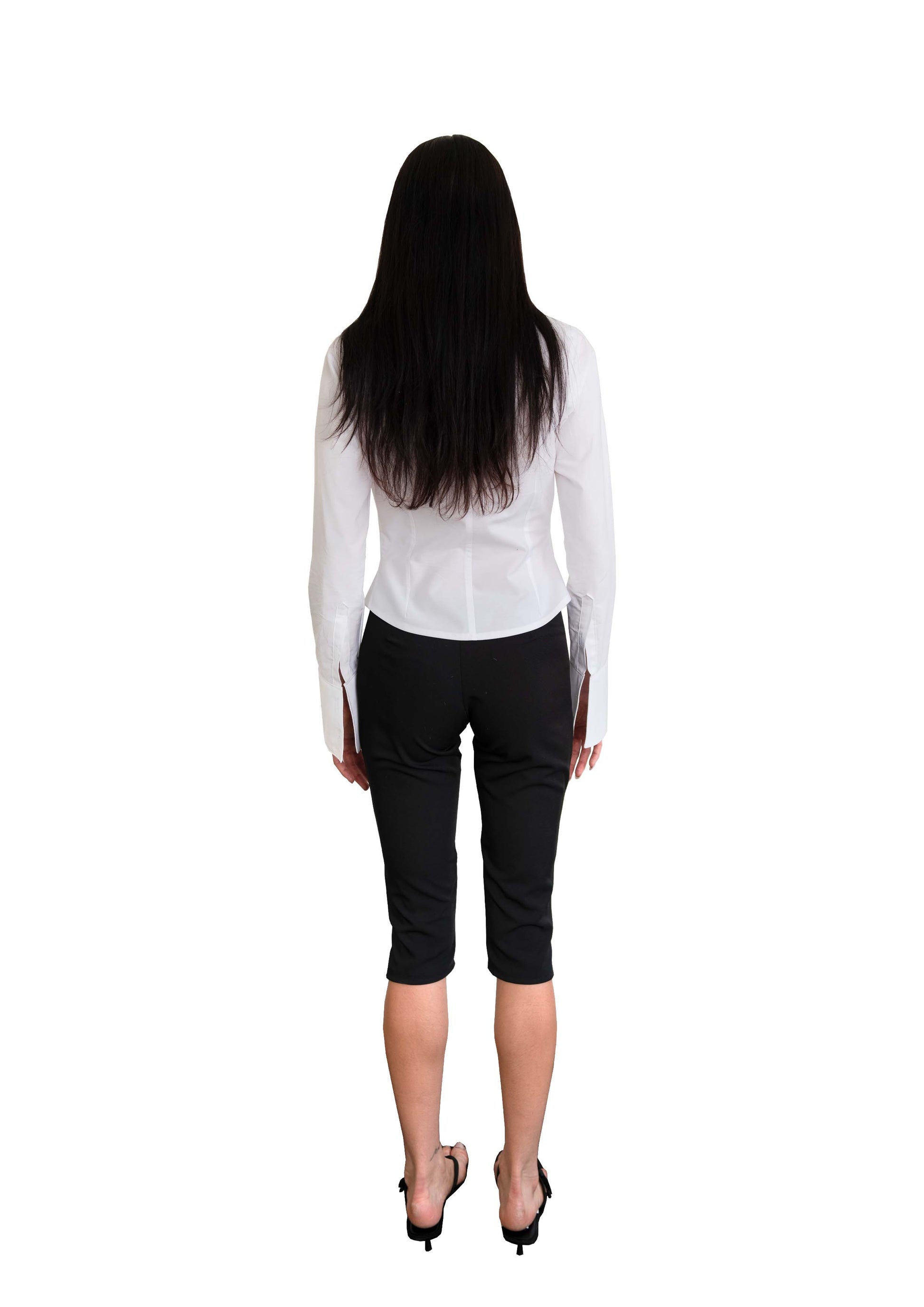 I am a star low rise capris designed with a "V" shape waistline to embrace your curves. made out of cotton poly suit pant material for a structured hold and a bit of give for comfort.